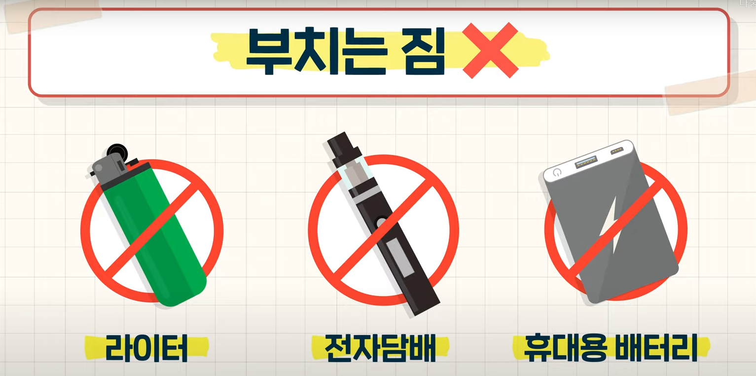 기본적으로 날카롭고 위험한 물품이나 100ml 이상의 액체류 등은 위탁 반입해야 하며, 전자담배, 라이터, 배터리 등과 같은 화재 위험이 있는 물품은 휴대해야 한다는 정도를 기억하시면 여행가방 챙기는데 조금은 수월하실 텐데요.