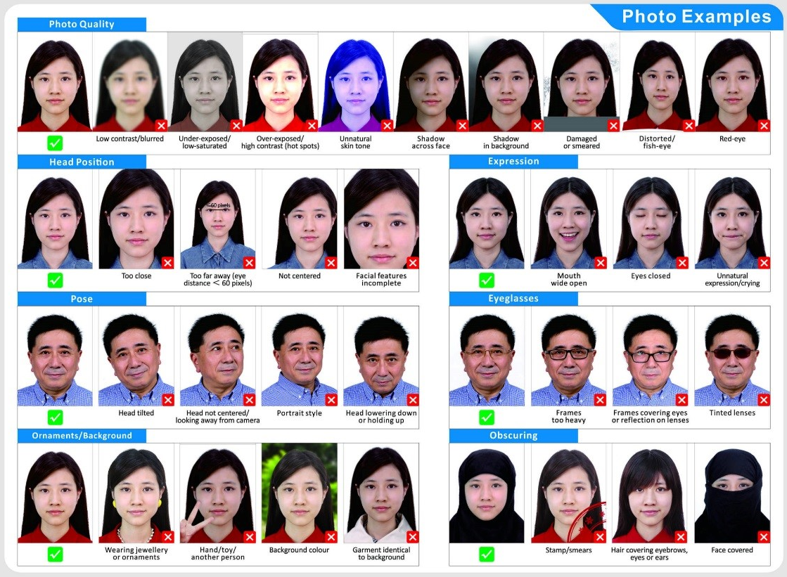 ◈ 여권 사진은 6개월 이내에 찍은 사진으로 사진 사이즈는 3.3x4.8 입니다. 배경은 흰색이어야 하고, 아래 예시처럼 안경이나 모자 등의 액세서리를 착용하면 안 됩니다.